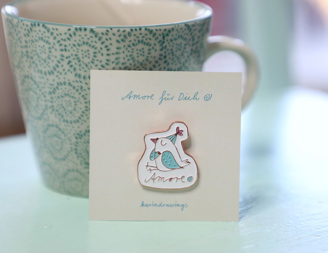 Der Amore-Pin ist da! Ja, Karin Drawings macht nicht nur Postkarten und super tolle Karten-Sets, sondern auch einen Börd Amore Pin. Muss natürlich dringend in die Welt hinaus getragen werden! Amore für Dich! So steht es auch auf dem Kärtchen, an das der Pin geheftet ist – super zum Verschenken! Für Dich und Deinen Lieblingsmenschen!
