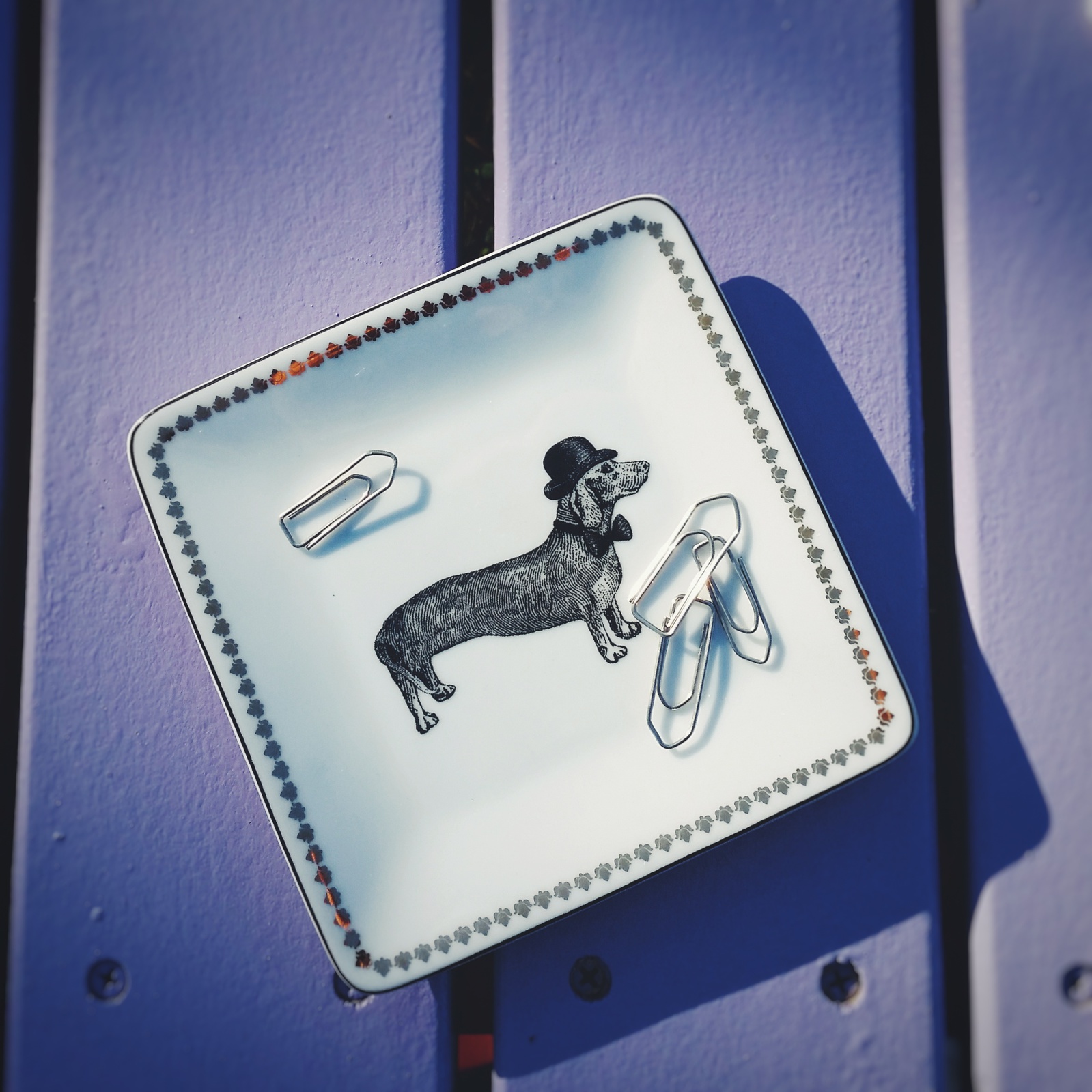 Quadratischer Keramik-Teller mit Dackel im Dandy-Style