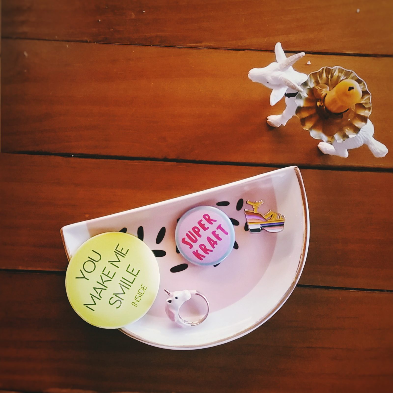 Alles Tutti Frutti oder was? Ein Stück Wassermelone- rosafarbenes Fruchtfleisch, schwarze Kernen – liegt auf dem Nachttischchäschtli. Hä? Was macht es da? Hehe, reingefallen :-) Schau genau hin - der goldglänzende Rand verrät, dass es sich hier um einen Schmuckständer handelt und nicht um das beliebte Sommergemüse (Ja! Melone ist keine Frucht, sondern ein Gemüse, lies hier)