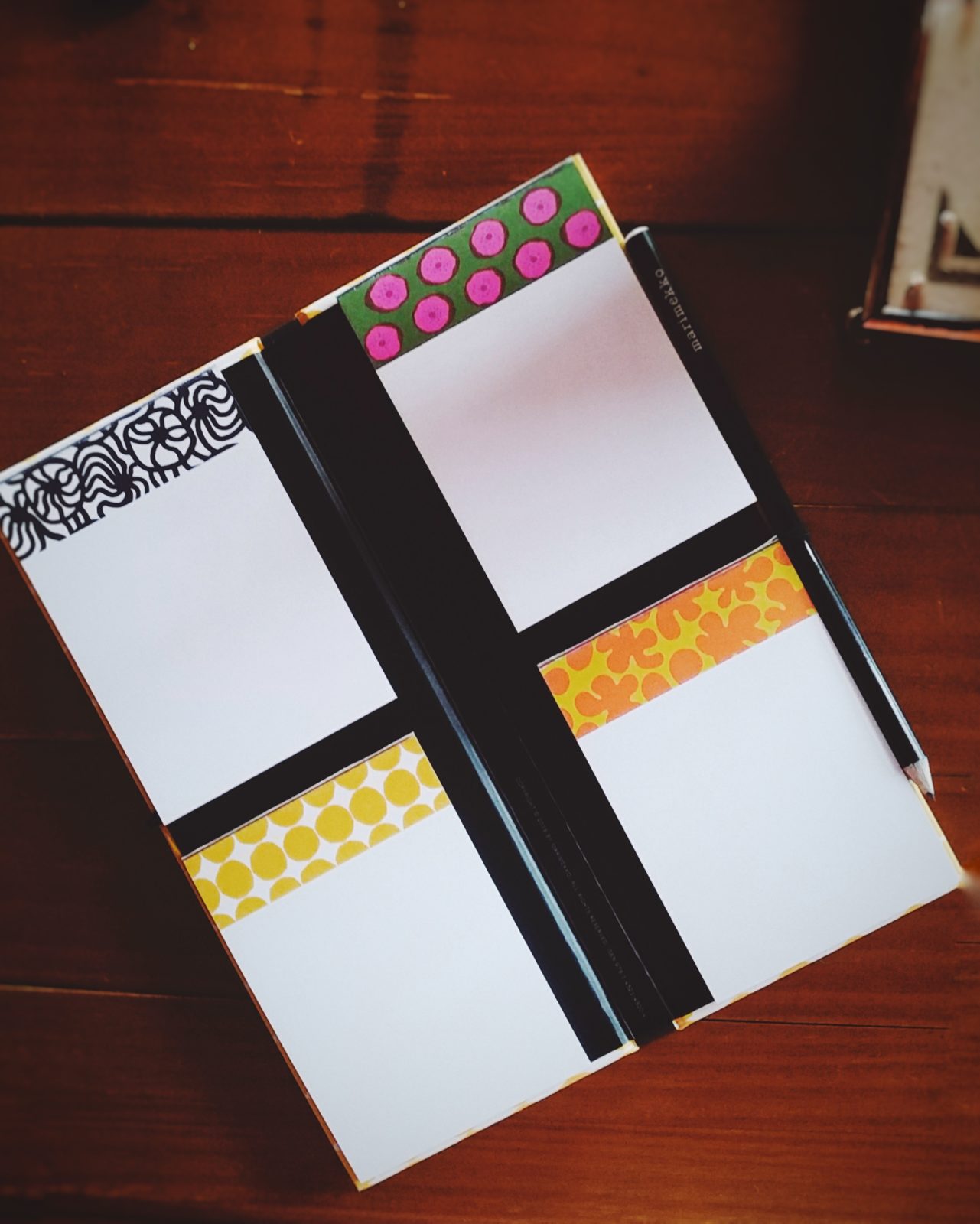 This elegant hardcover list ledger contains four notepads adorned with Marimekko's beloved designs, plus a coordinating pencil that slips through attached elastic loops.