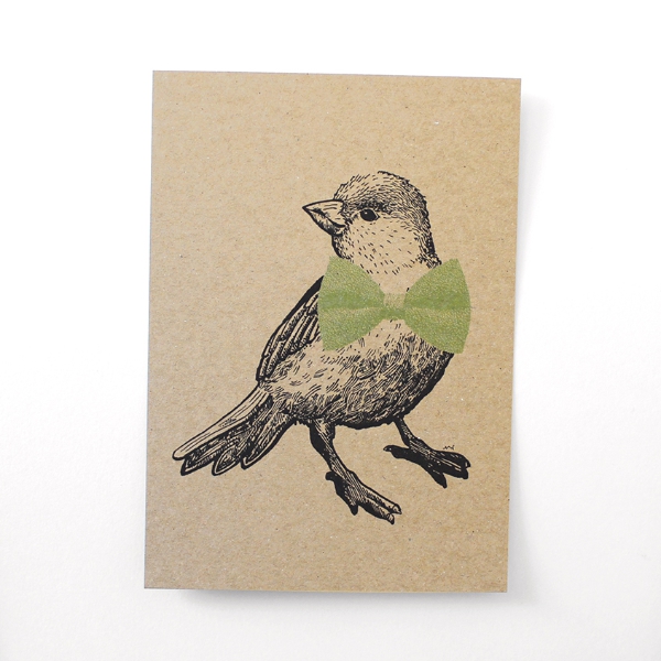 Gewitzt schaut der Monsieur Spatz mit seiner grünen Fliege aus.