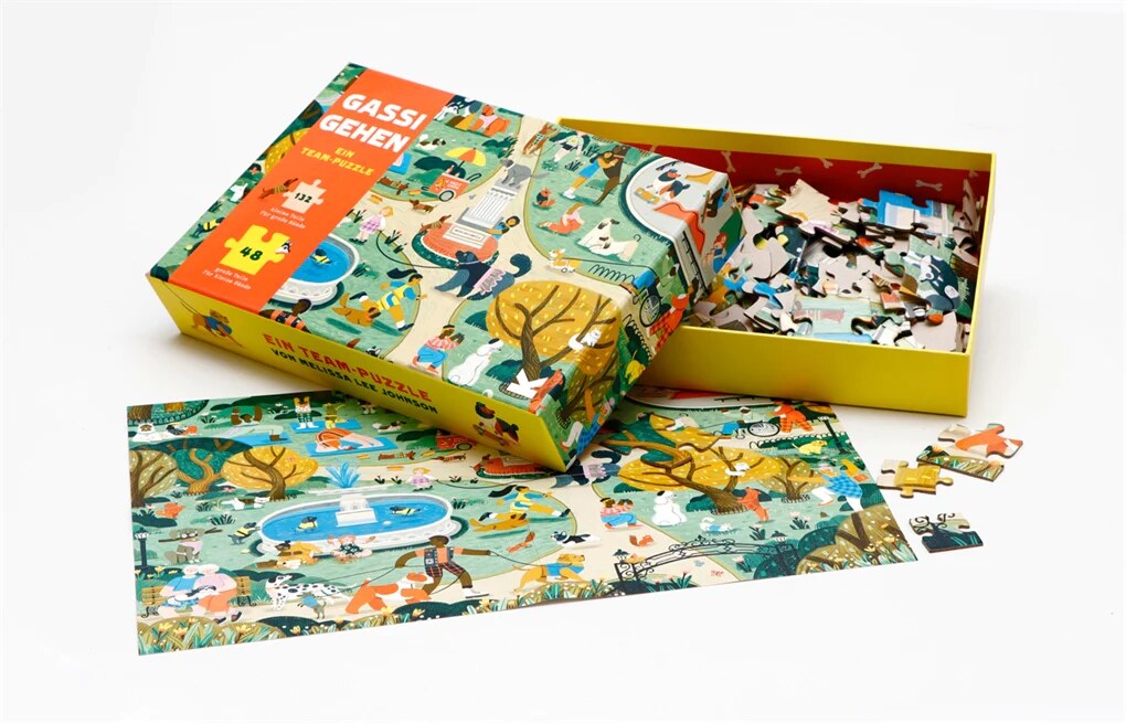 Gassi gehen eignet sich hervorragend für Puzzlefans mit unterschiedlichen Fähigkeiten und für gemeinschaftliches Puzzeln: Denn das Team-Puzzle enthält 180 Teile in zwei verschiedenen Grössen - grosse Teile für kleine Hände und kleine Teile für grosse Hände. So können Erwachsene oder grössere Kinder gemeinsam mit kleineren Kindern dasselbe Puzzle zusammensetzen. Und auch die lustigen Details auf dem fertigen Puzzle sorgen für jede Menge Spass!