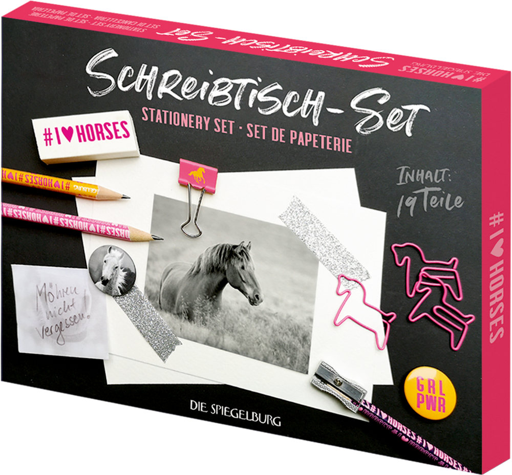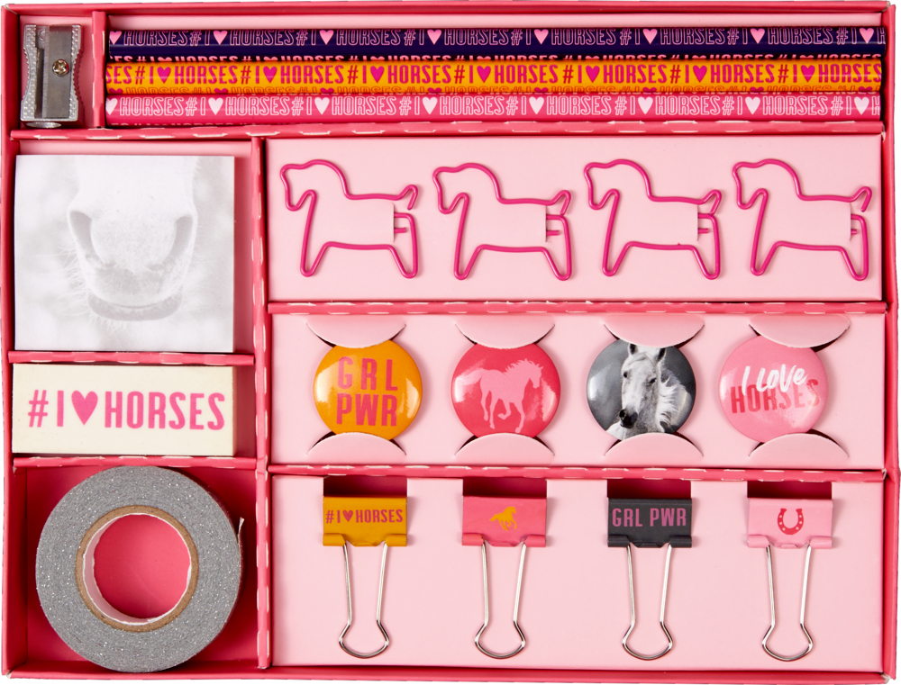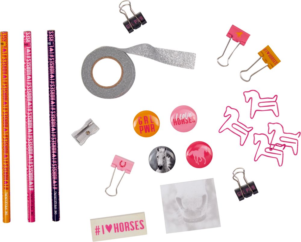 - Inhalt: 3 HB Bleistifte aus Holz mit Aufdruck, 4 Büroklammern in Pferdeform, 4 Papierklemmen mit verschiedenen Aufdrucken aus der Pferdewelt, 1 Anspitzer, 4 Magnete aus Metall mit Aufdruck aus der Pferdewelt, 1 Glitzer Washi Tape und 1 I love Horses Radierer aus Kunststoff