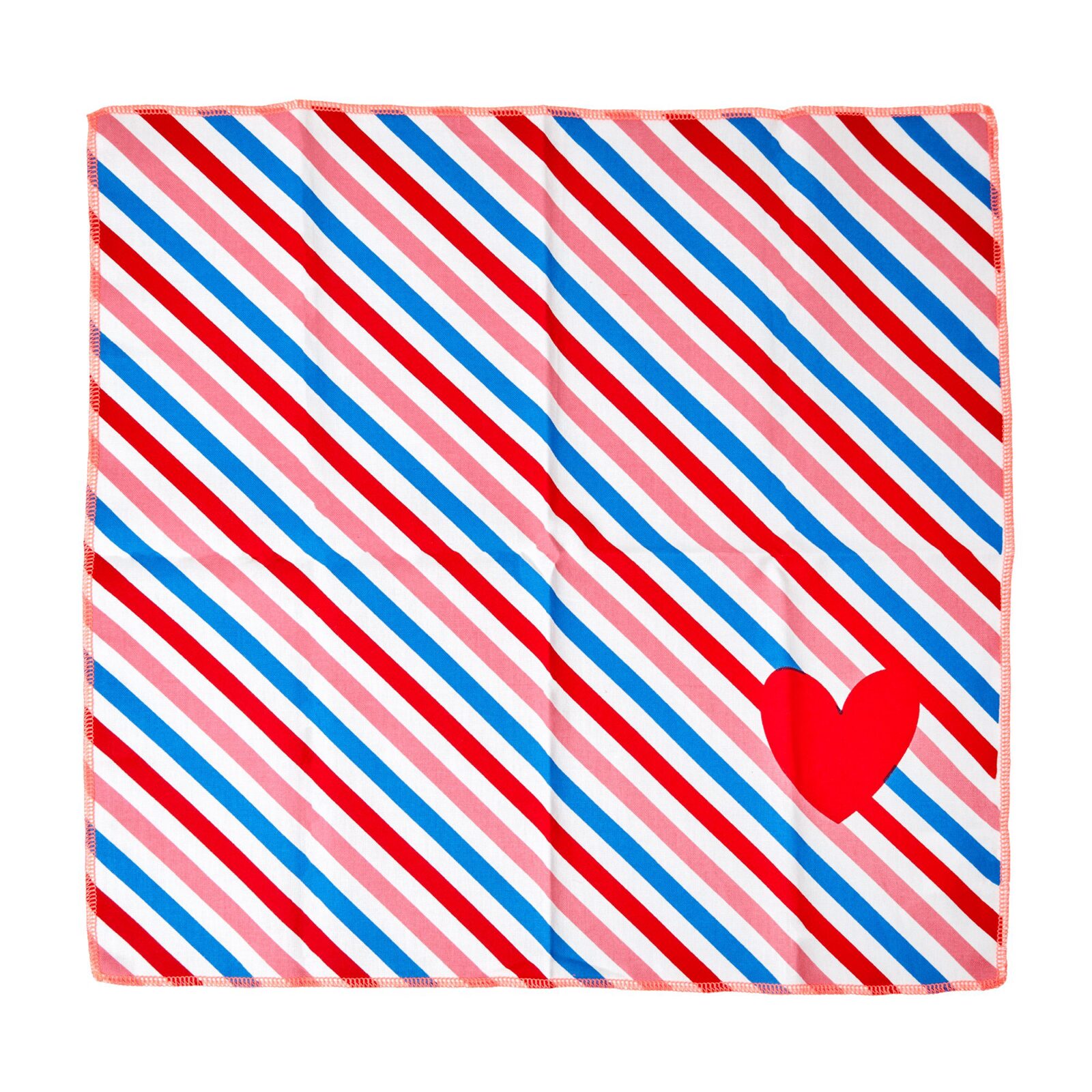Auf weissem Hintergrund sind rote, rosafarbene und blaue Streifen aufgedruckt. Unten rechts strahlt ein grosses rotes Herz. Der ganze Rand der Serviette ist in schönem kontrastfarbenem Neonpink eingefasst.