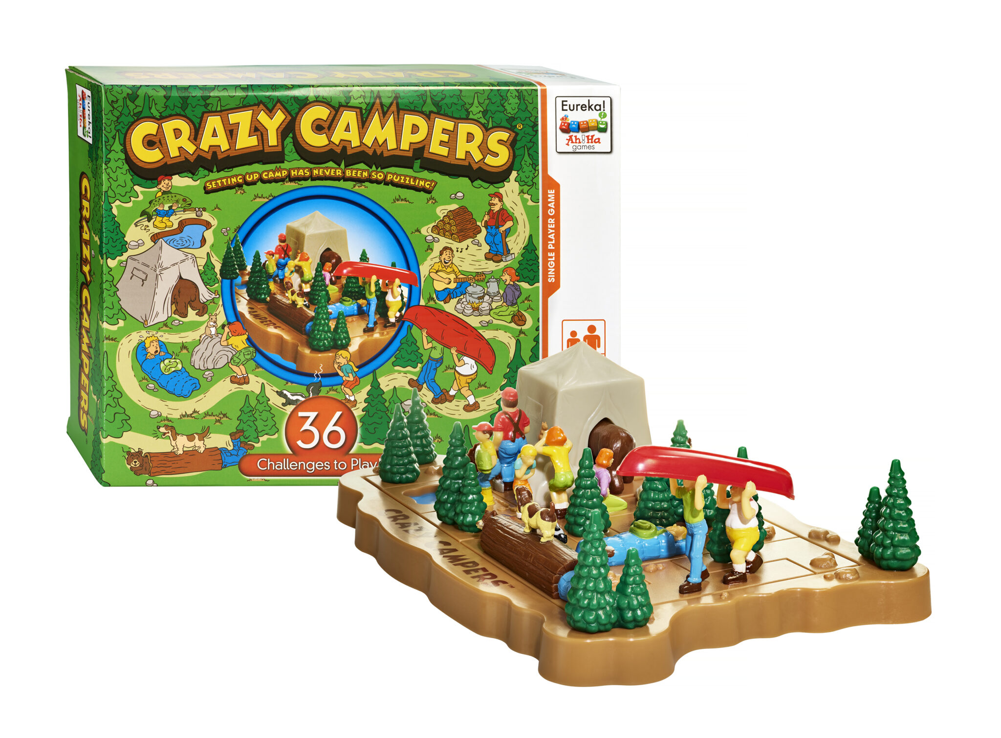 Crazy Campers von Eureka Puzzle Toys ist ein Gehirnjogging-Puzzle. In 36 verschiedenen Aufgaben musst Du das Zelt auf dem Campingplatz aufstellen. Es gibt 13 Herausforderungen auf dem Campingplatz für Anfänger und 23 Herausforderungen für erfahrene Camper.
