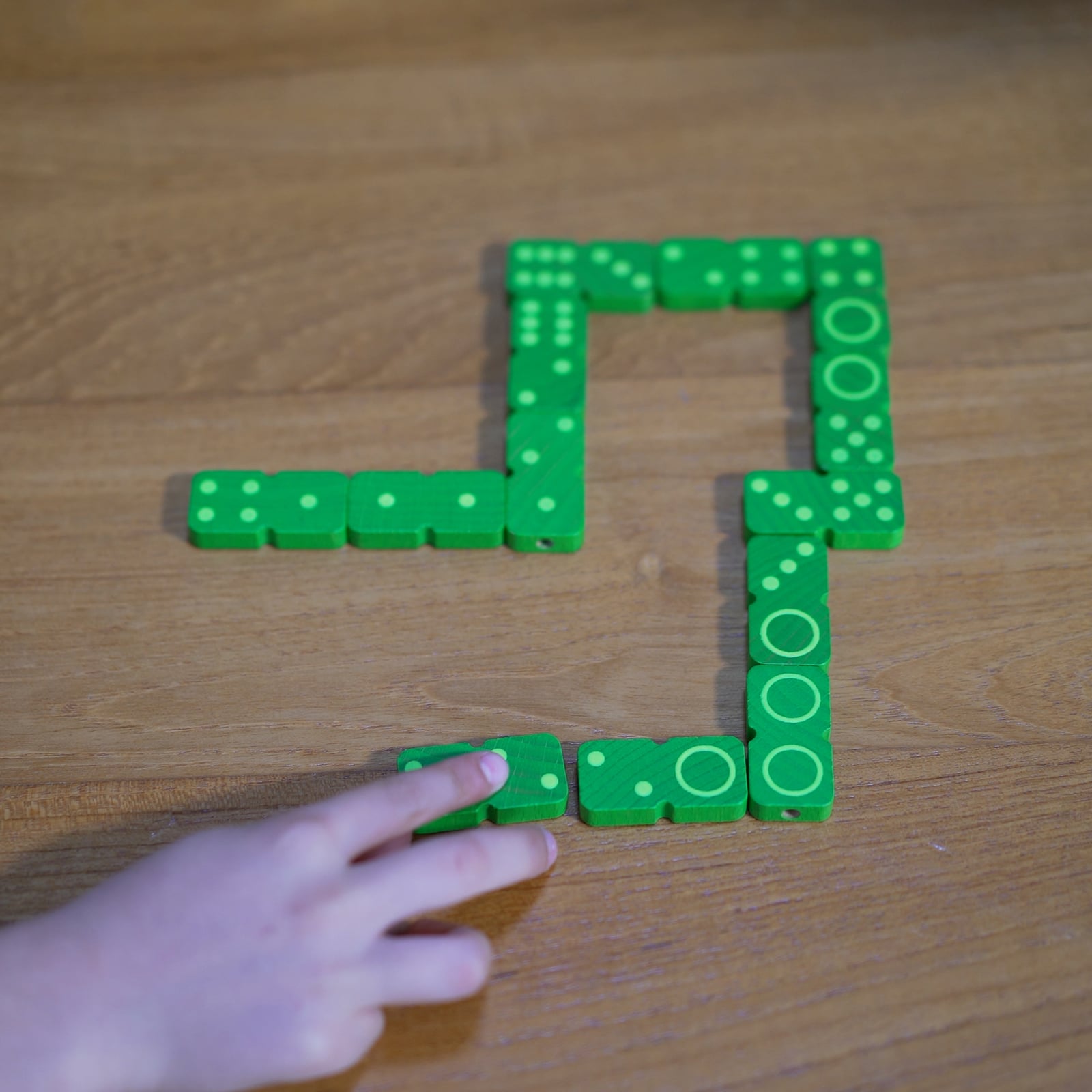 ANLEITUNG: Legt die Plättchen verdeckt aus. Jeder Spieler nimmt sich 7. Bei 2 Spielern bleiben die anderen 14 Plättchen auf dem Tisch liegen. Der:die Spieler:in mit der doppelten 6 oder dem Plättchen mit der höchsten Zahl ist zuerst dran. Der:die erste Spieler:in spielt ein Plättchen und dann ist der:die nächste Spieler:in links dran. Wenn diese:r Spieler:in ein Plättchen hat, das auf einer Seite die gleiche Punktzahl hat wie das soeben gespielte, legt er:sie es senkrecht oder waagerecht an dieses Plättchen an. Wenn nicht, ist der:die nächste Spieler:in an der Reihe (in der 4-Spielende-Version) oder er:sie zieht ein anderes Plättchen vom Tisch (in der 2-Spielende Version). Es gewinnt, wer zuerst keine Plättchen mehr hat.