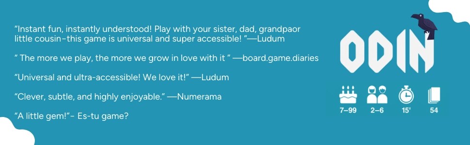 Odin ist ein einfaches und dynamisches Spiel für die ganze Familie mit schnellen Runden und weitreichenden Entscheidungen. Geht strategisch vor, sammelt die Karten, die am besten zu eurer Strategie passen, und bahnt euch euren Weg zum Ruhm und werdet König oder Königin von Walhalla.