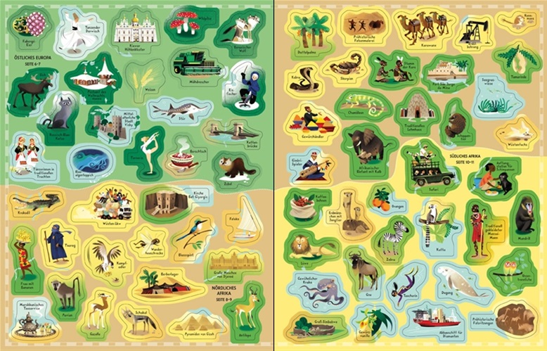 Stickern Menschen, Tiere und Sehenswürdigkeiten zuordnen.