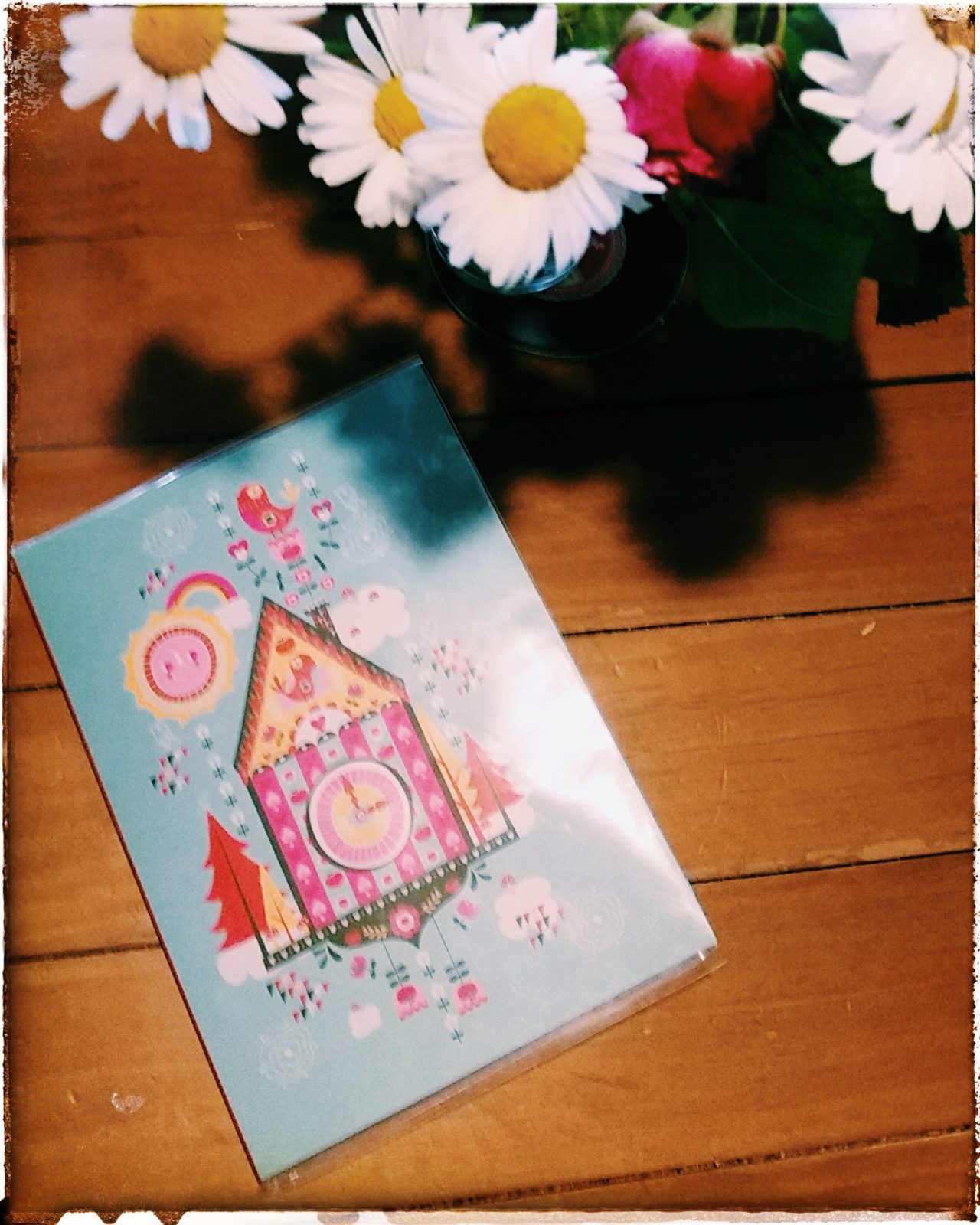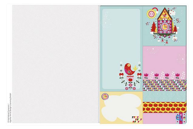 Ein Vögeli auf einer Blume, eine Kuckucksuhr, eine Blumenwiese, eine Wolke, bunte Wimpel, Äpfelchen, Blümchen und Fliegenpilze helfen Dir Dich zu organisieren, während die fröhlich bunten Bilder und Dir ein Lächeln ins Gesicht zaubern.