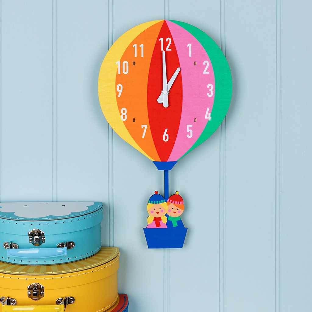 Eine tolle Dekoration für jedes Kinderzimmer: farbenfrohe Wanduhr in Form eines Heissluftballons, mit einem Korb der das schwingende Pendel der Uhr ist.