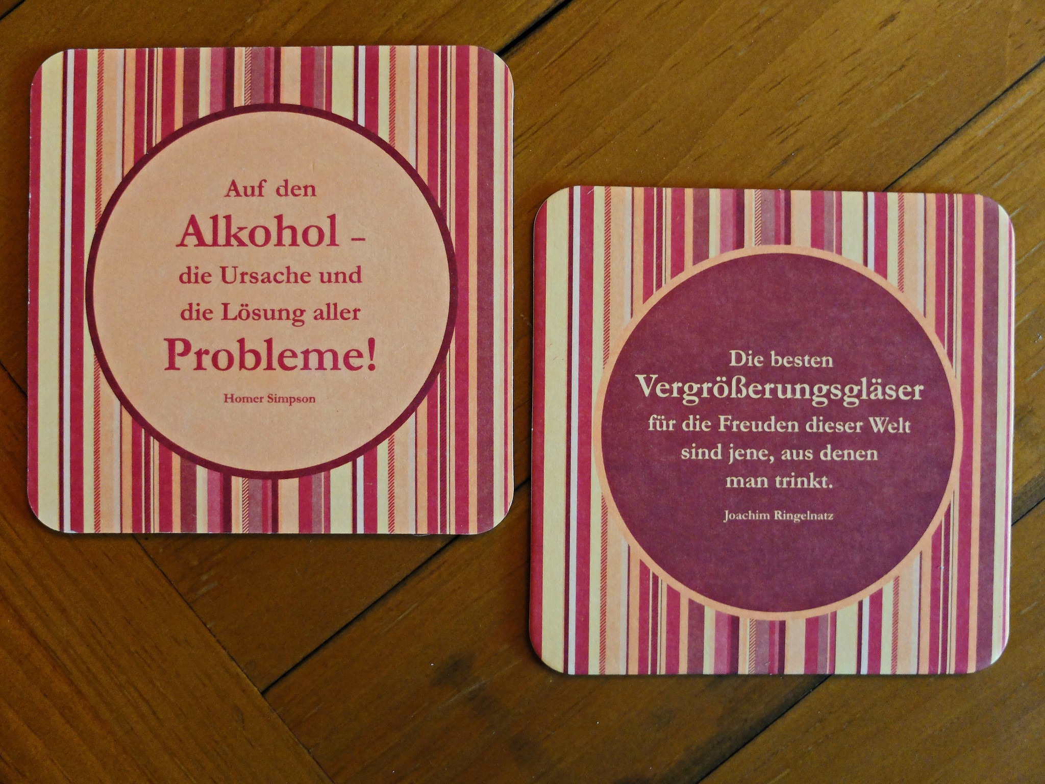 Auf  der einen Seite steht ein Zitat vom Dichter Joachim Ringelnatz, auf der anderen vom Alltagsphilosophen Homer Simpson mit dem Motto „Freuden dieser Welt“.