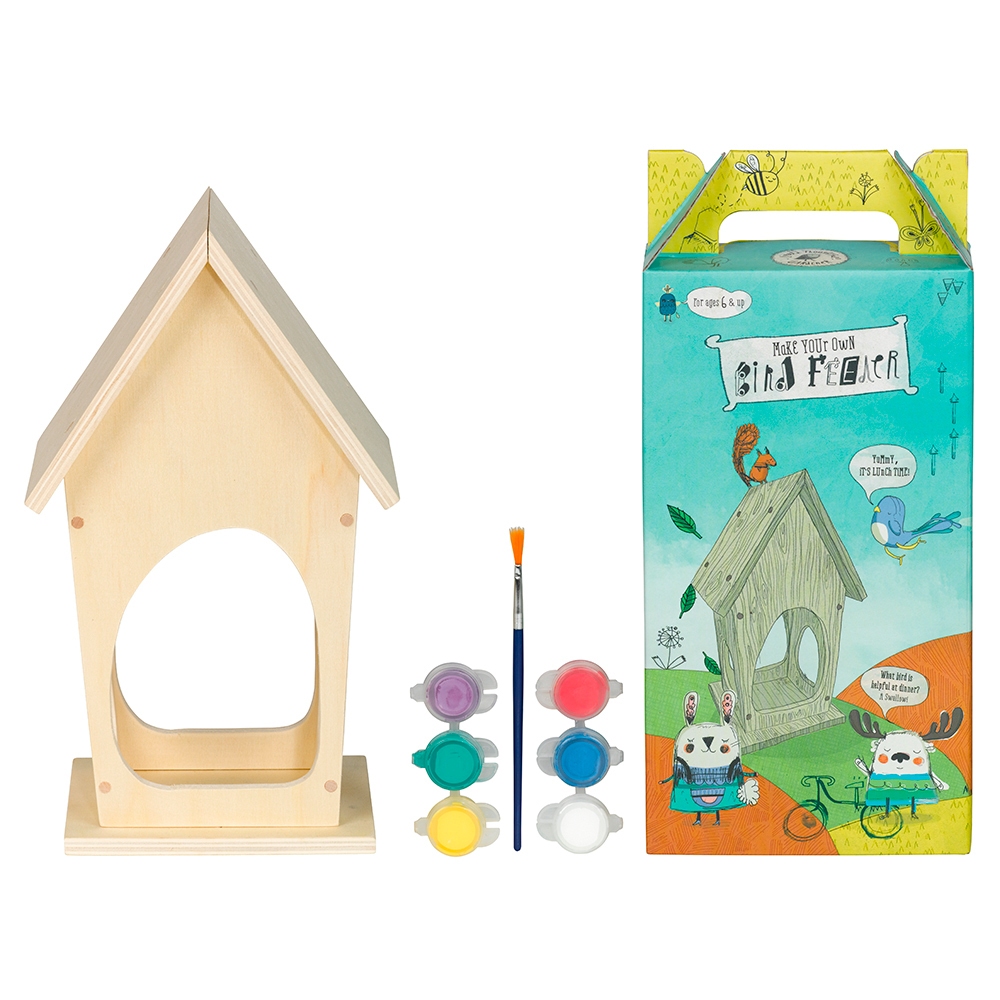 Mache Dein eigenes Futterhäuschen! Einfach die bereits zurechtgeschnittenen Seiten mit Boden und Dach zusammenstecken und dann mit den beigelegten Farben und Pinsel bemalen. Und am schönsten Platz im Garten oder auf dem Balkon aufhängen.